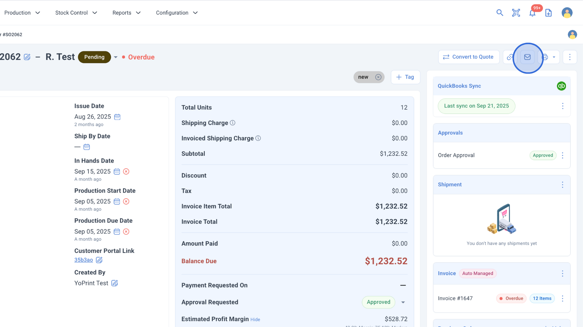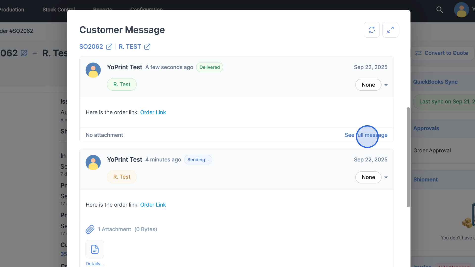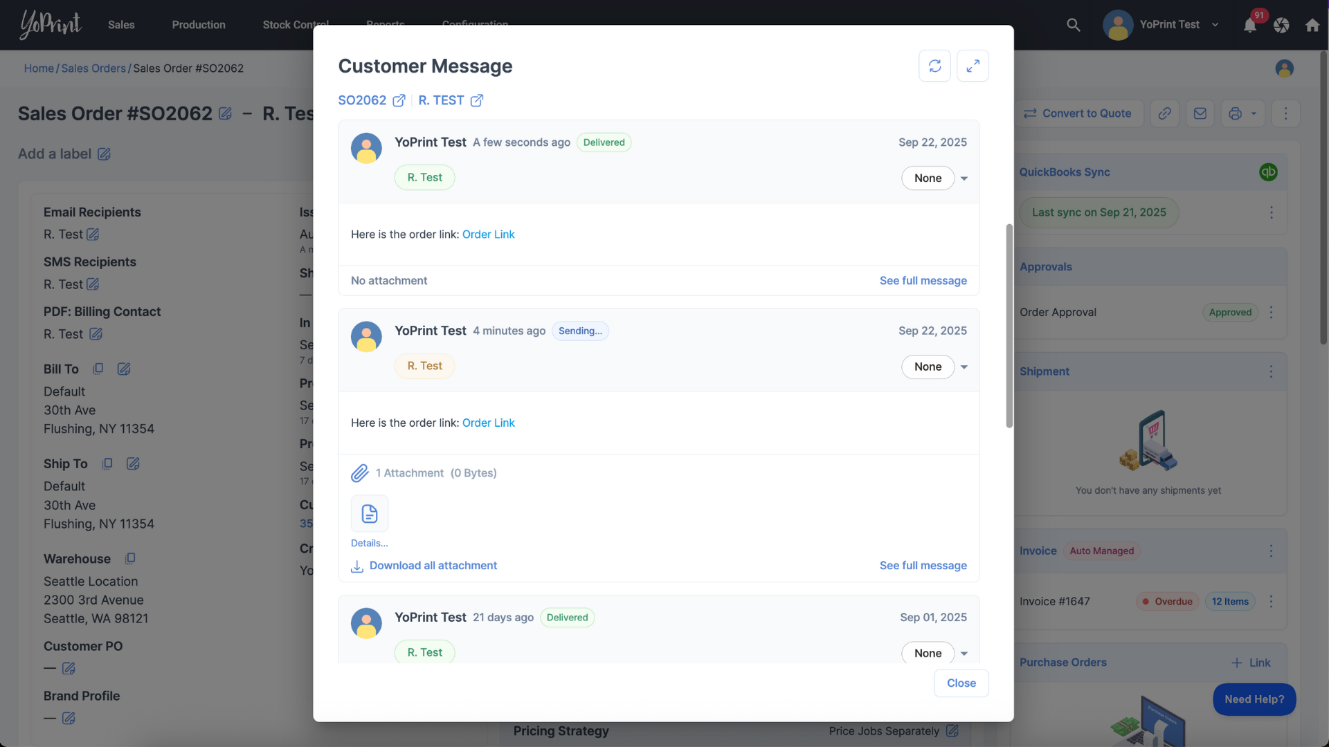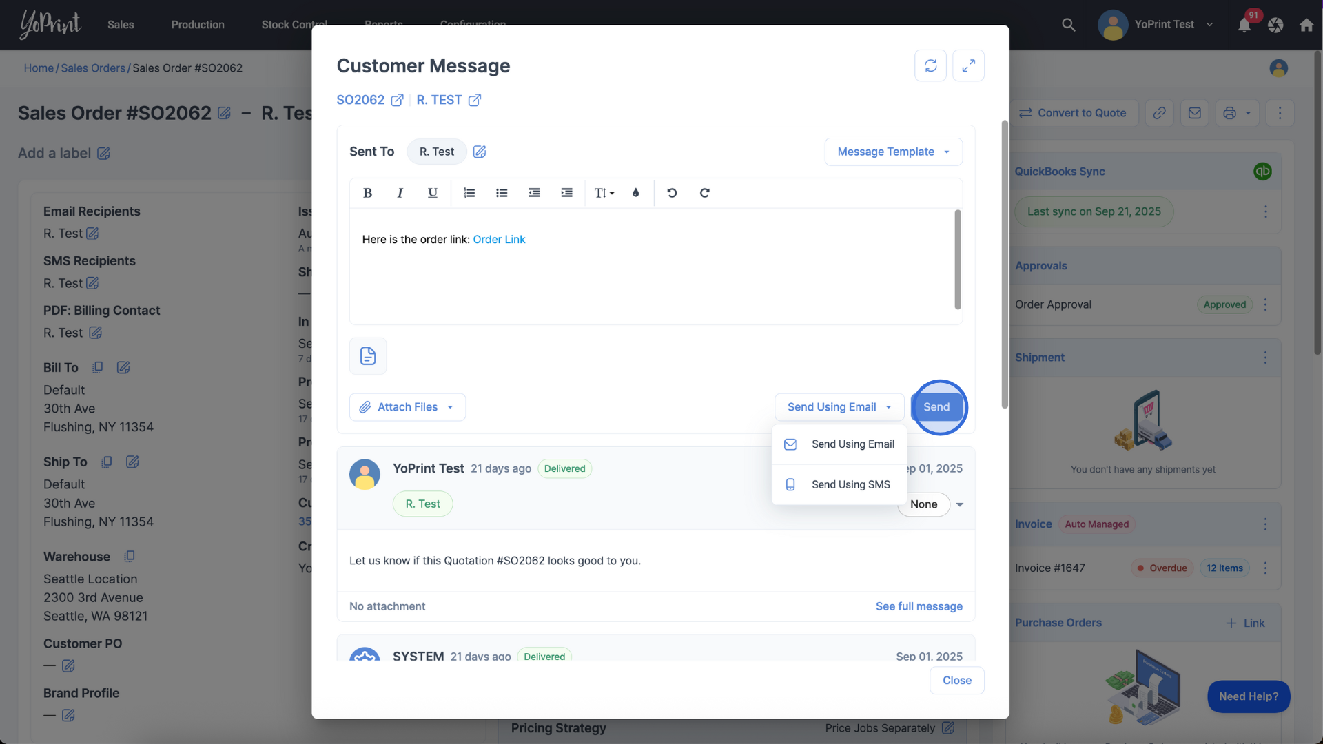 YoPrint lets you send messages to your customers directly from a Sales Order or Quote. This is useful for sharing updates, attachments, or clarifications without leaving the app.