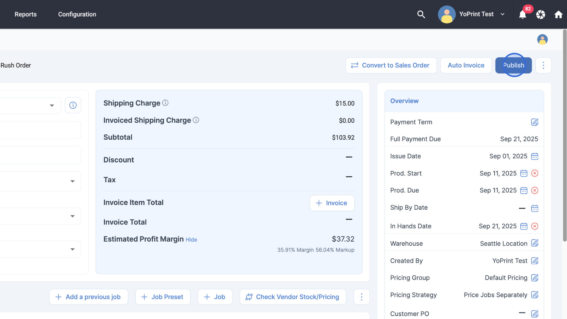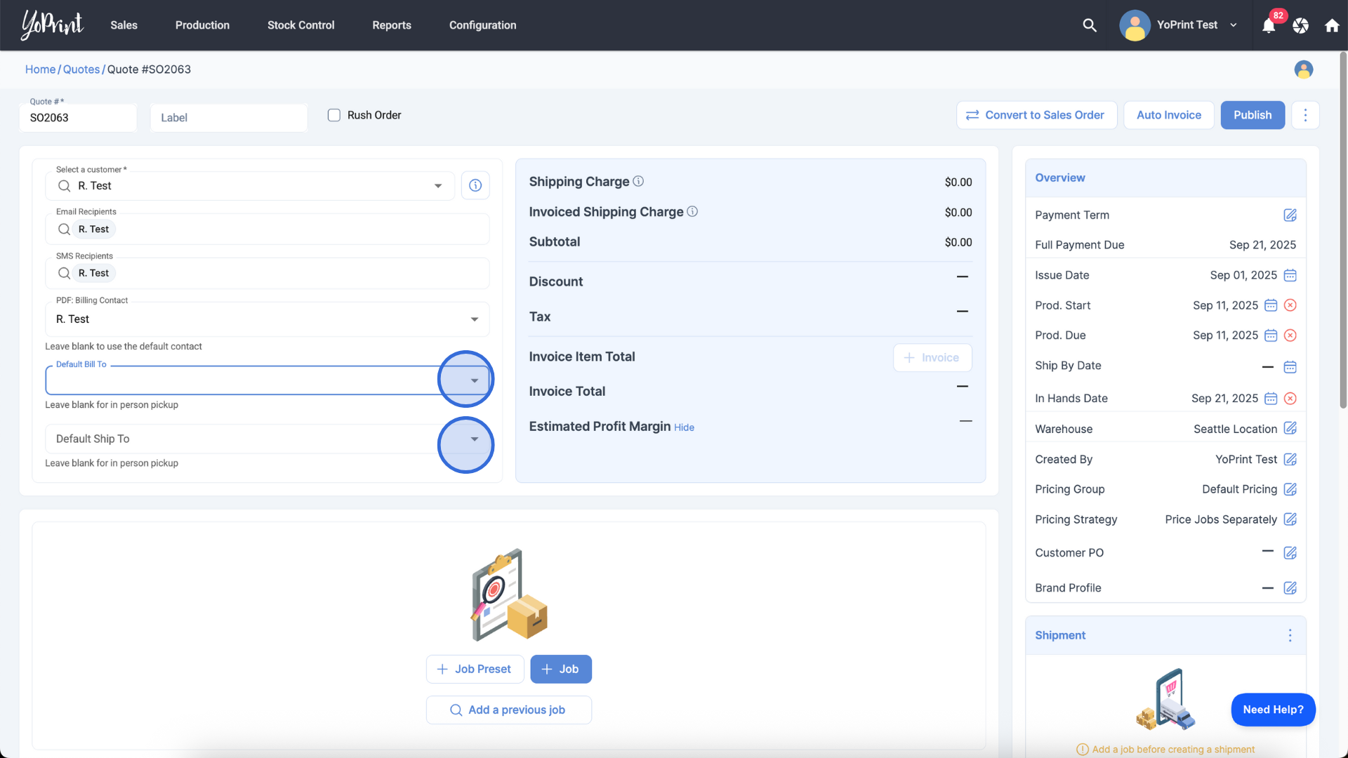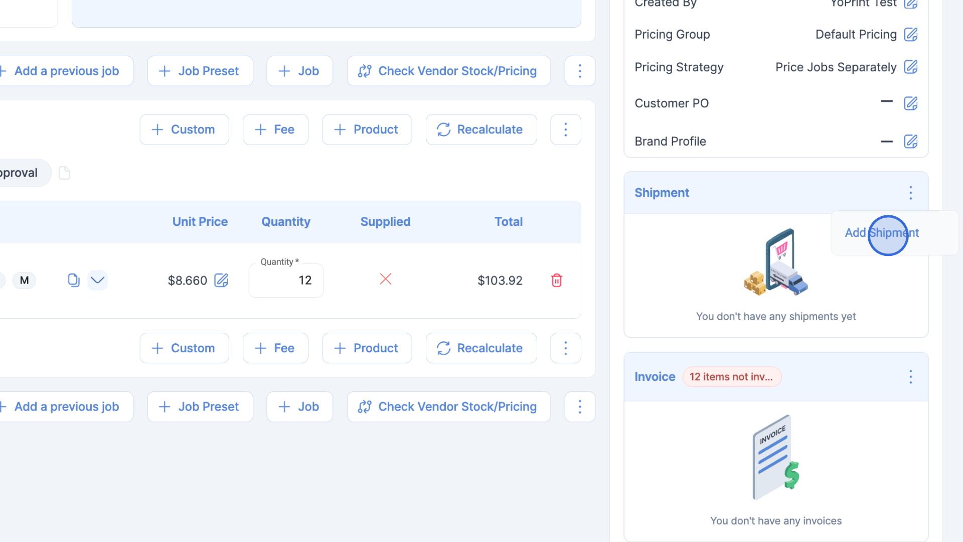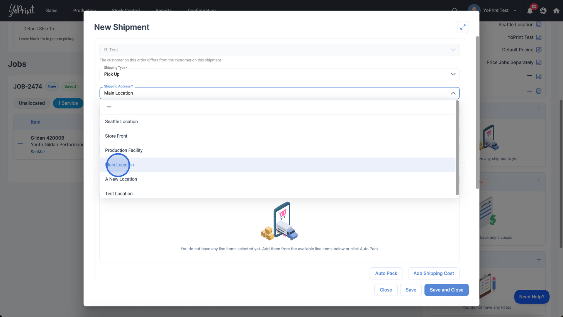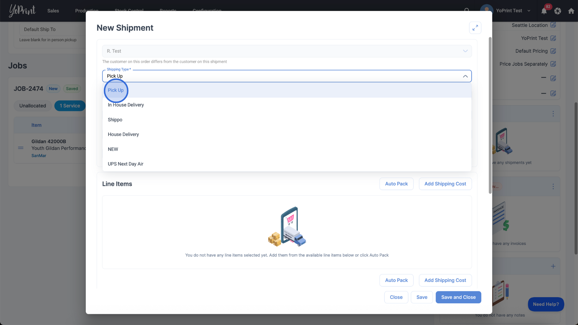 In YoPrint, you can create pickup orders by setting the shipment method to Pick Up. This allows customers to collect their orders directly from your chosen location. You can also combine pickup with delivery in a single order by adding multiple shipments.