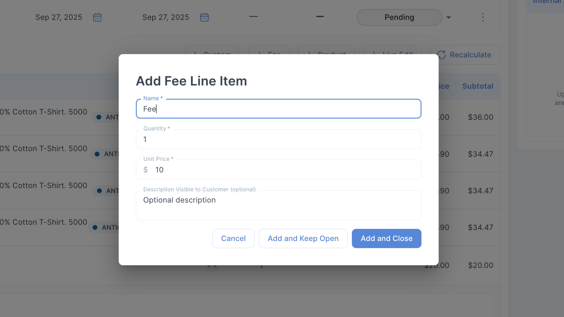 3. Enter the name, quantity, unit price, and description.