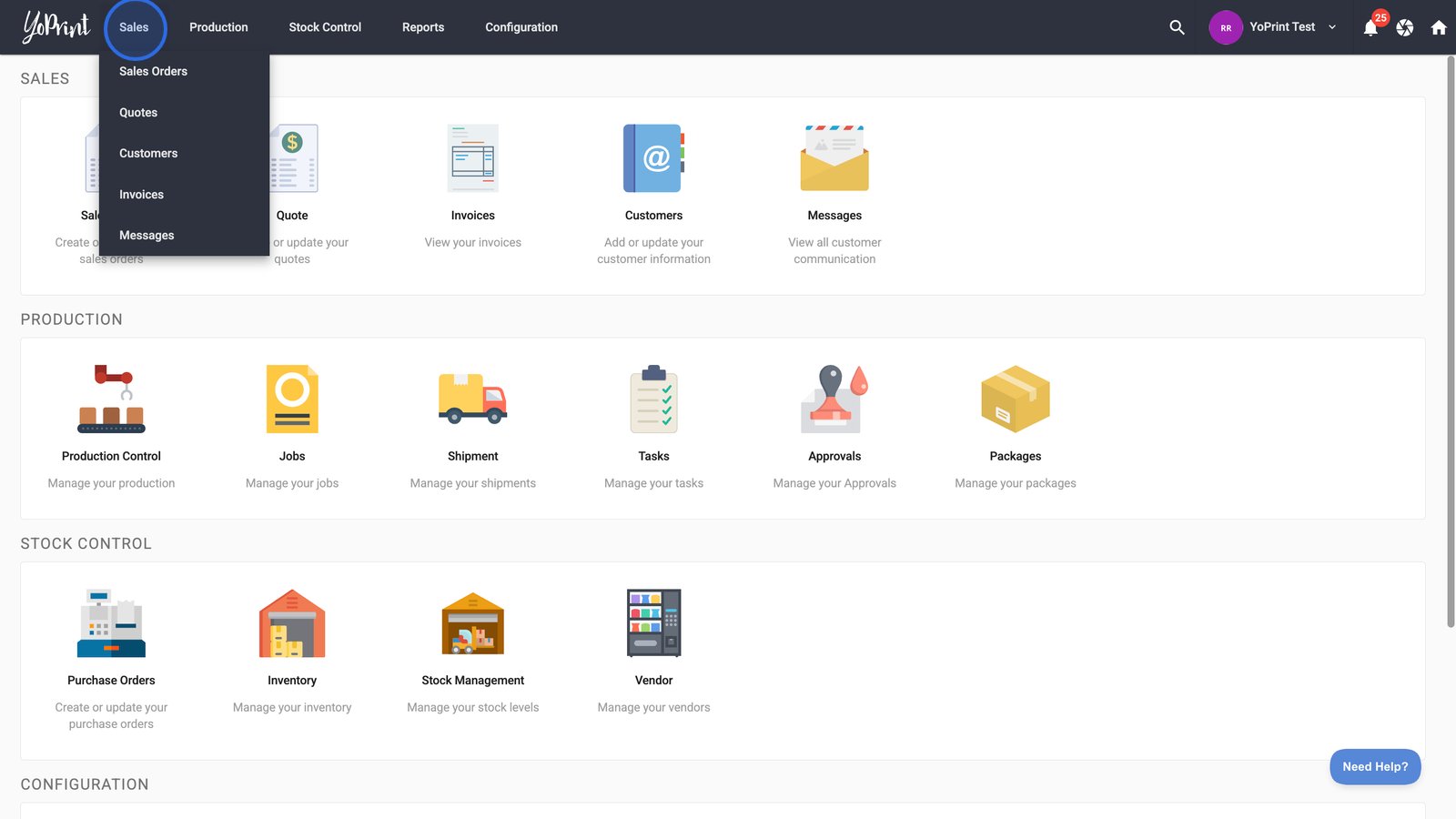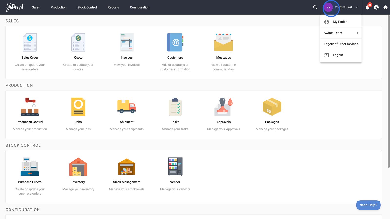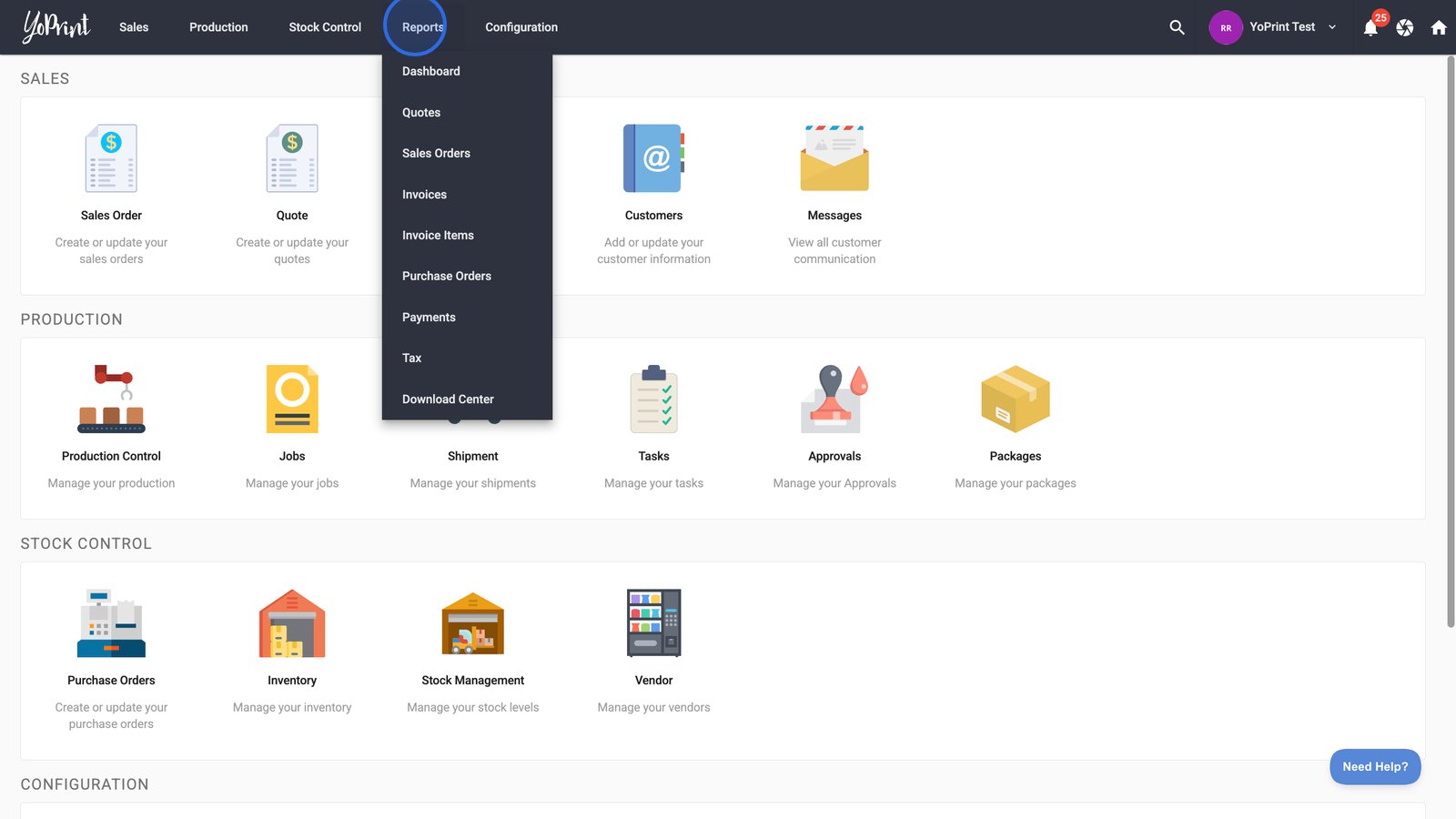 The YoPrint dashboard serves as your central hub for navigating key areas of the platform. From sales and production tracking to inventory, reports, and account settings, the dashboard provides quick access to your tools, helping you manage your business efficiently.
