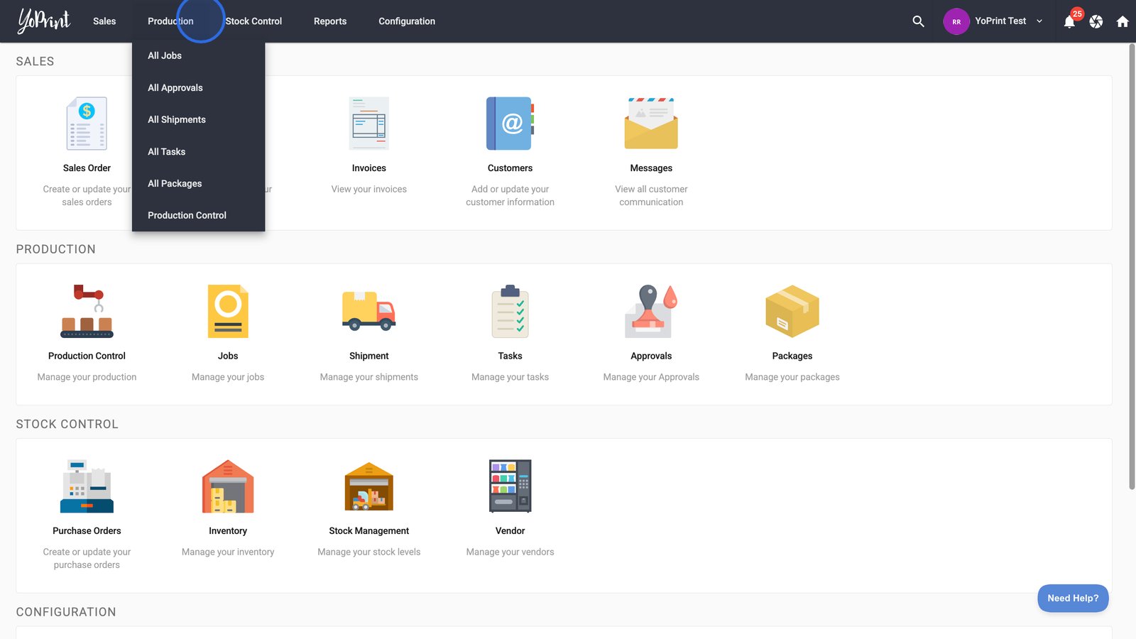 Access the Production menu to view and manage production-related tasks, including jobs, approvals, shipments, and packages.