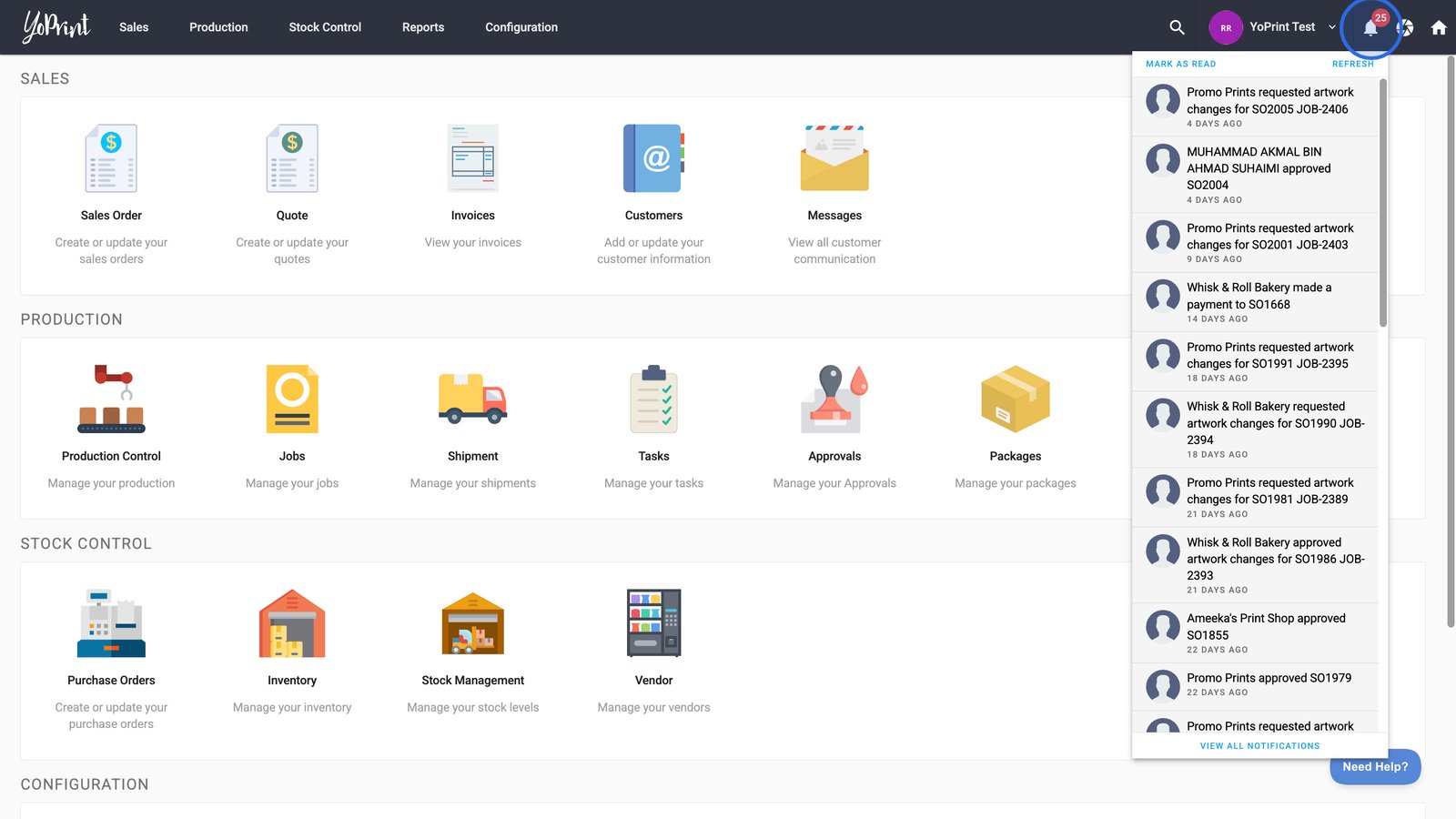 View the notifications panel for real-time updates and alerts on orders, approvals, payments, and more.