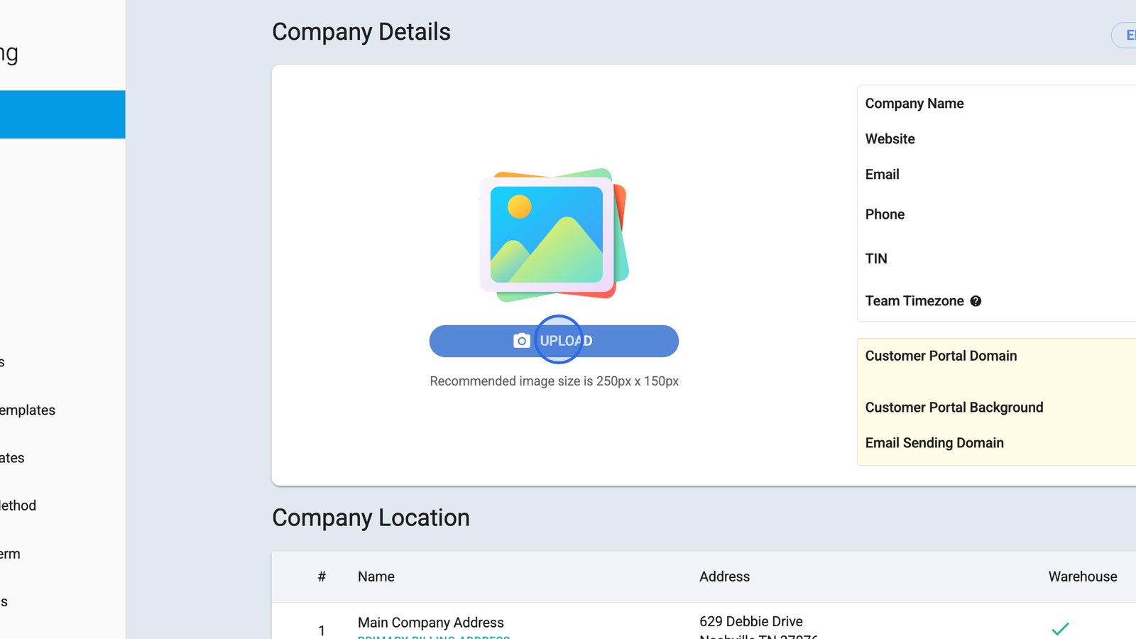 - You can upload or change your company logo by clicking the Upload button beneath the image placeholder.
