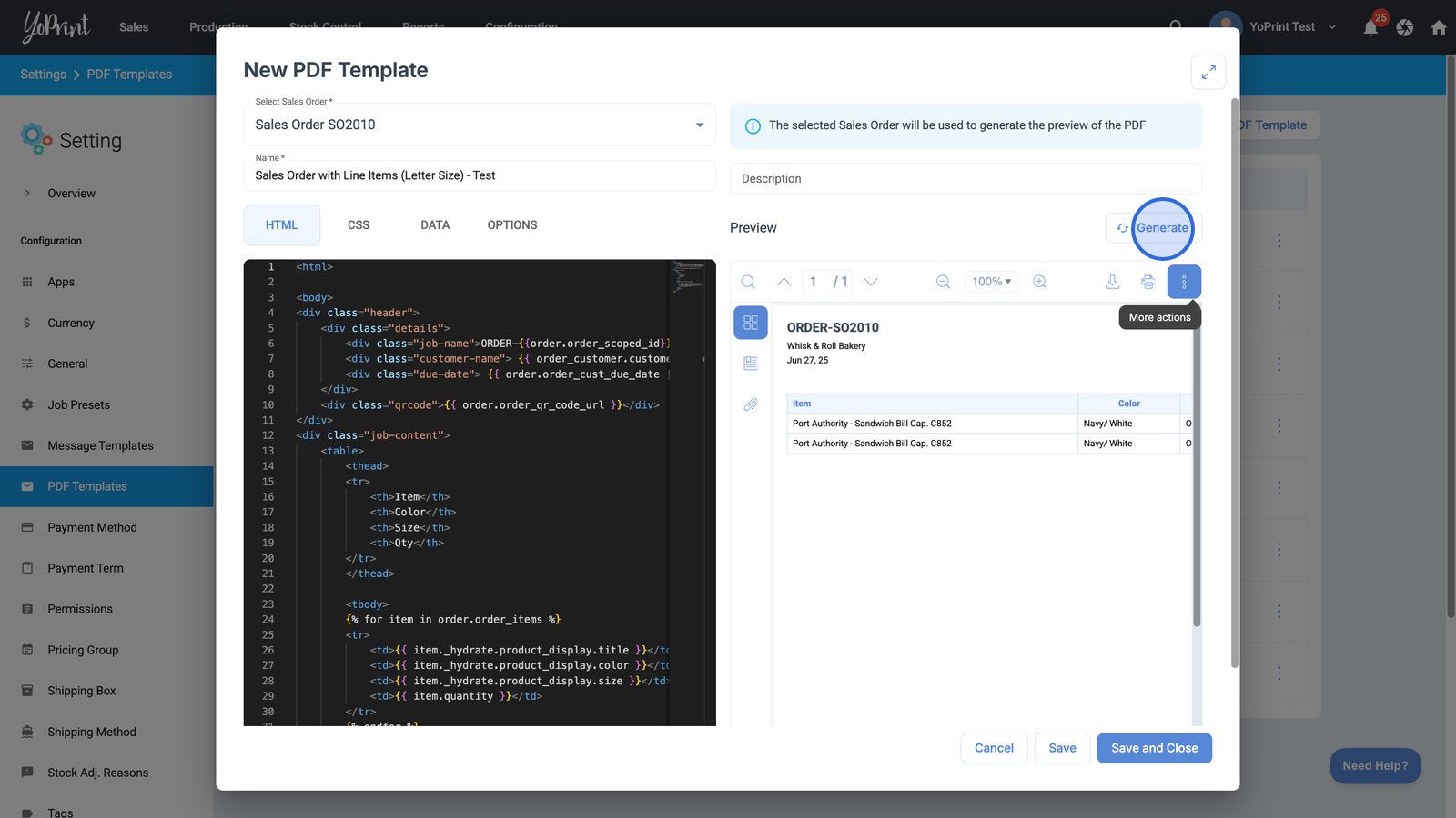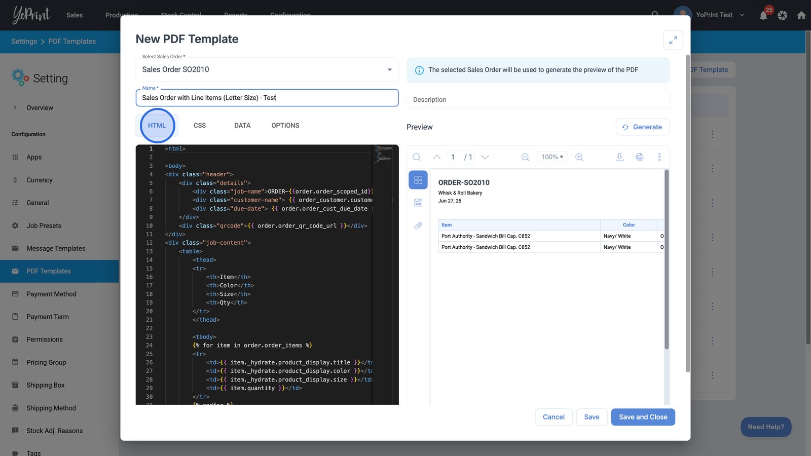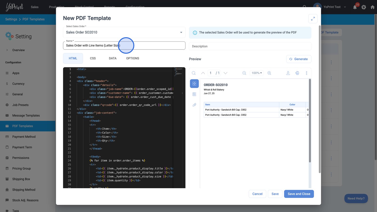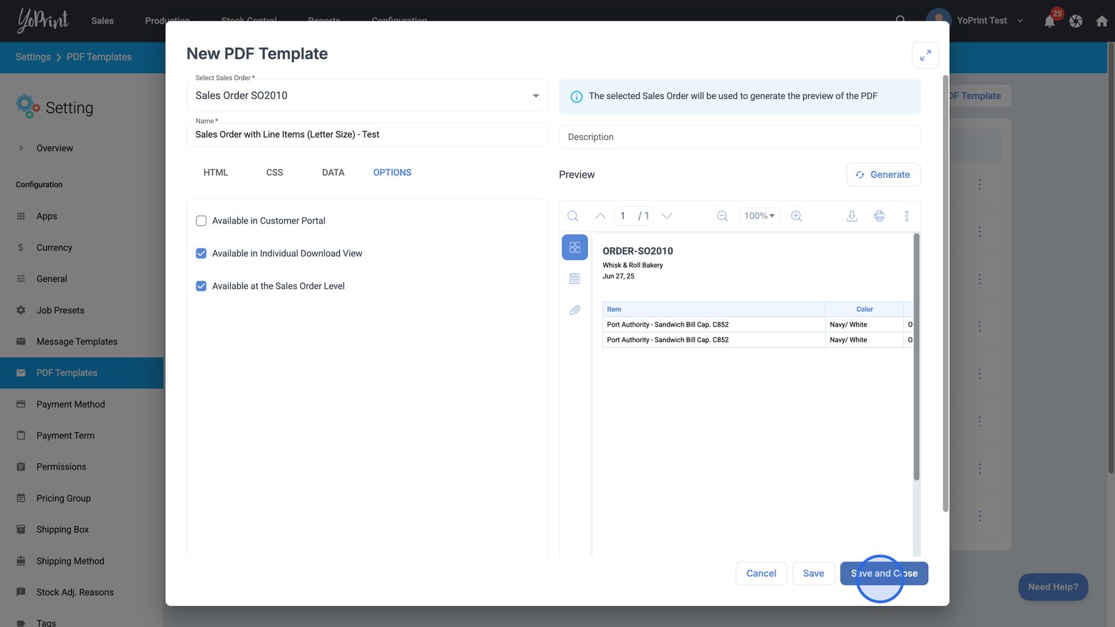 - Click Save and Close to finalize your custom PDF template and exit the editor.