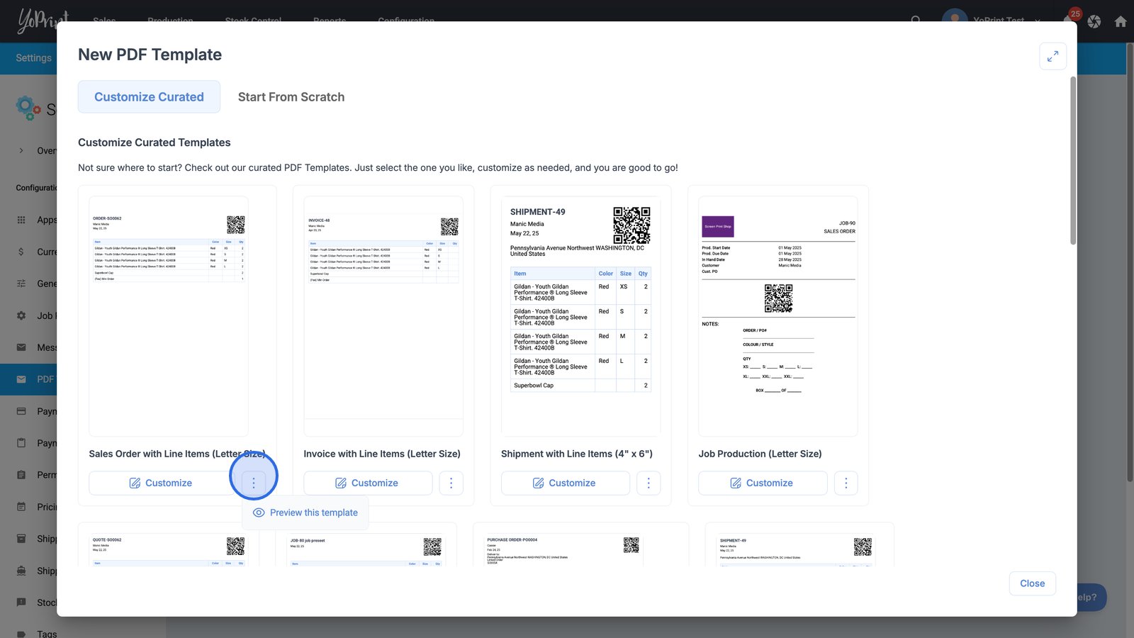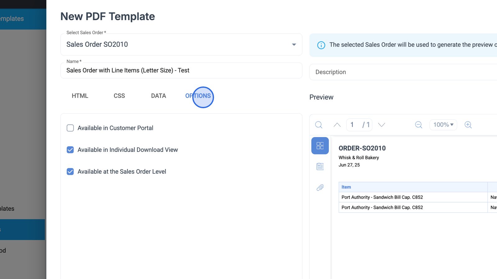 - Click the more options menu and click Preview this template. Let's use a Sales Order template in this example.