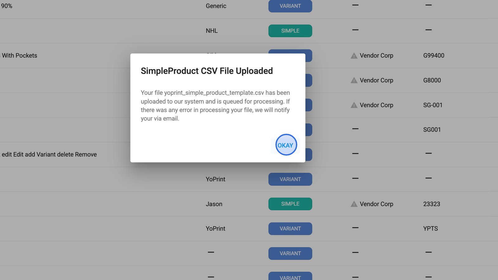 - Upload your file and click OKAY to confirm your CSV upload and proceed with processing your product data.