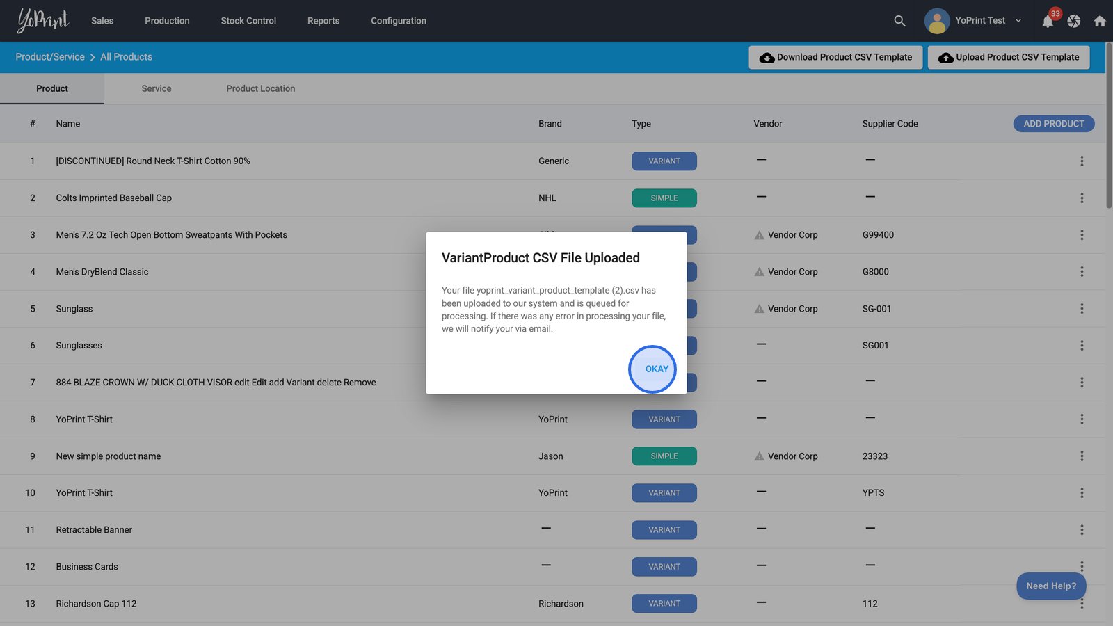 Learn how to download a CSV template, upload product data, and confirm successful import in YoPrint.