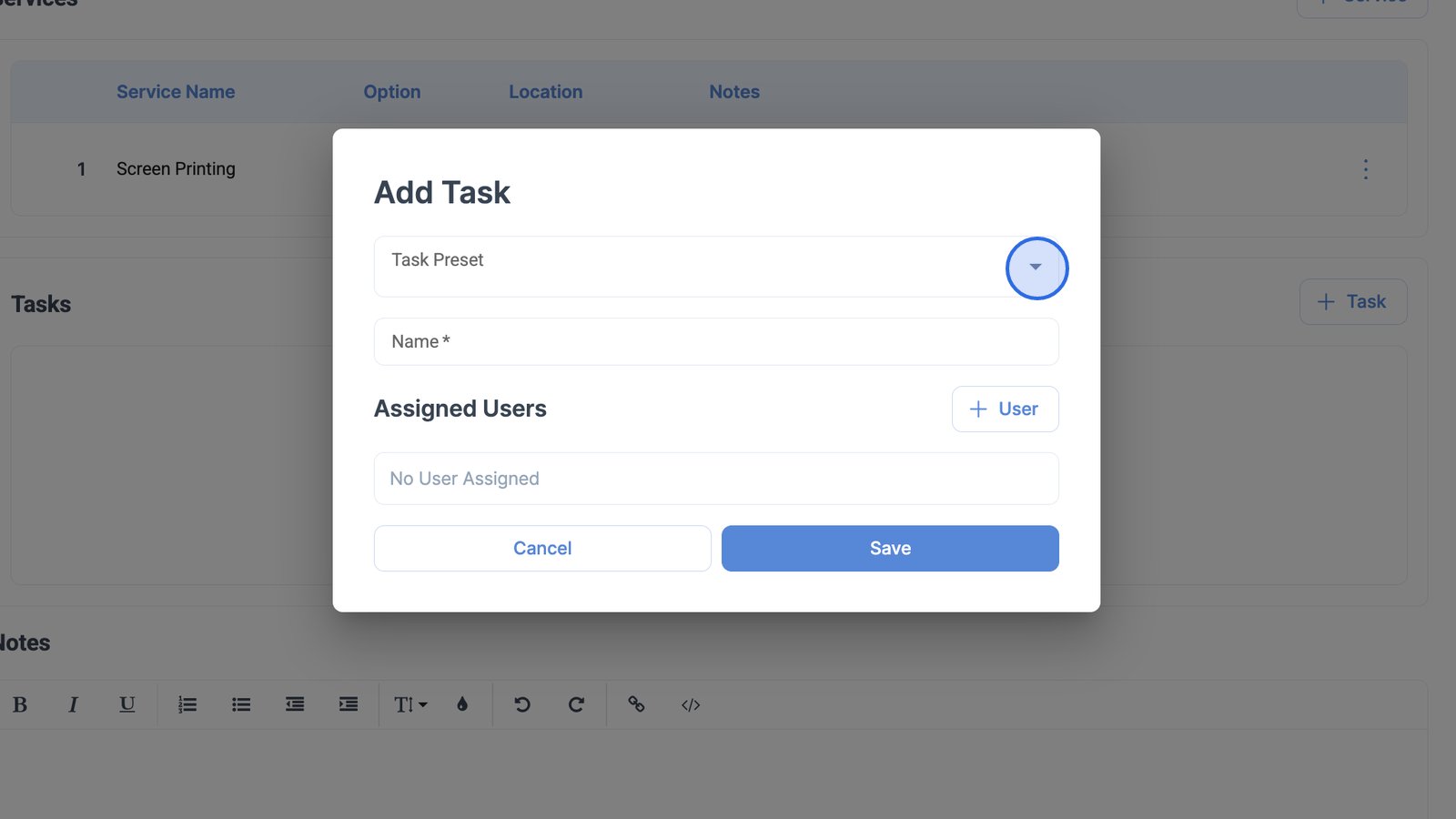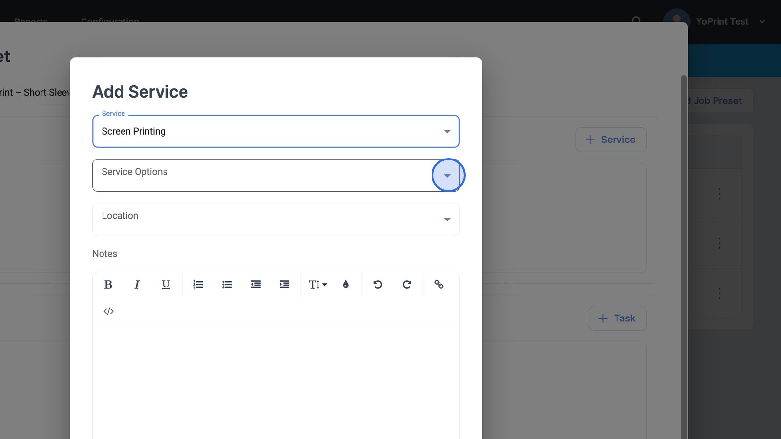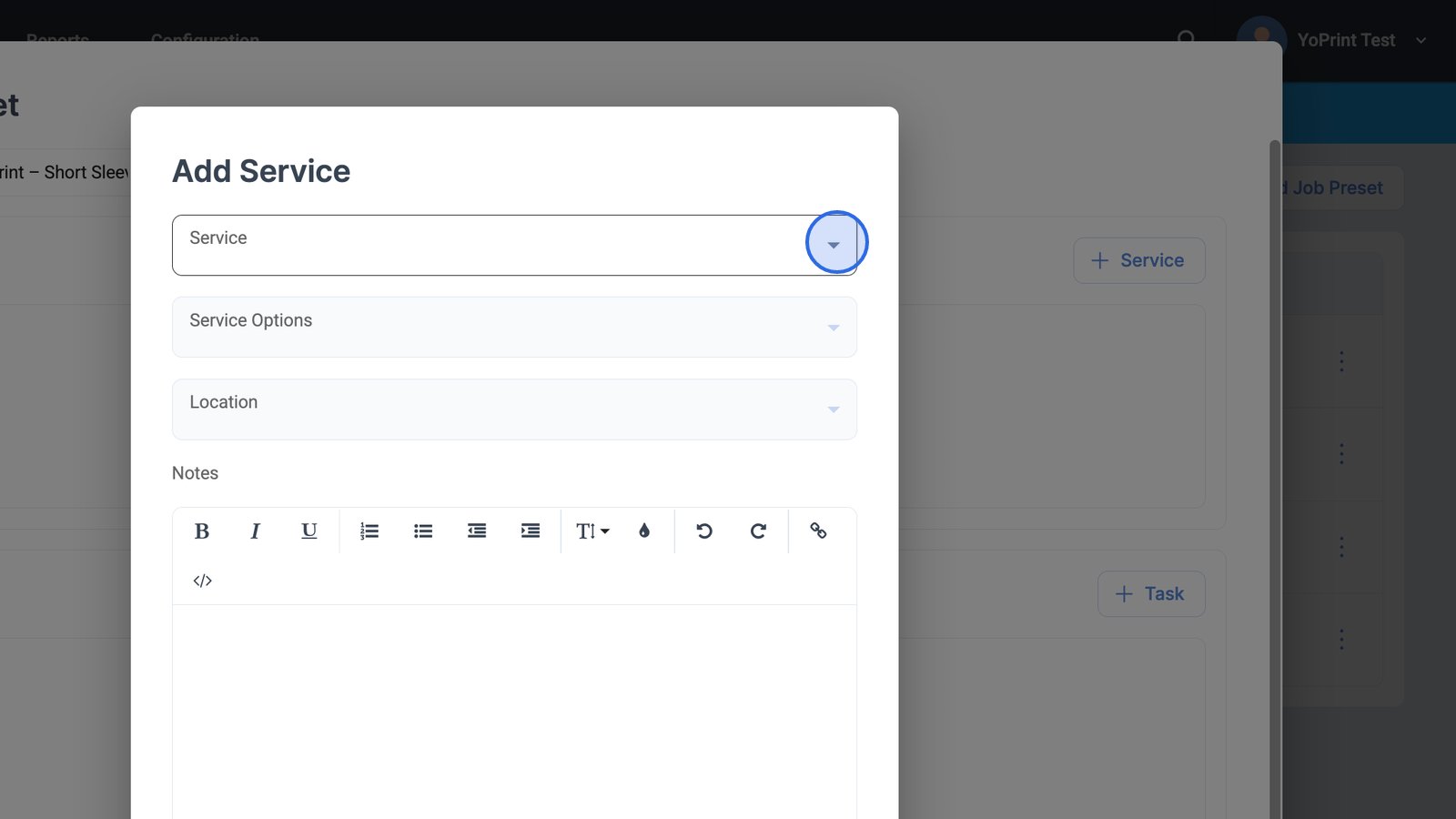 - Open the Service dropdown to choose which service you want to add to this job preset. Do this for Service Options and Location as well.