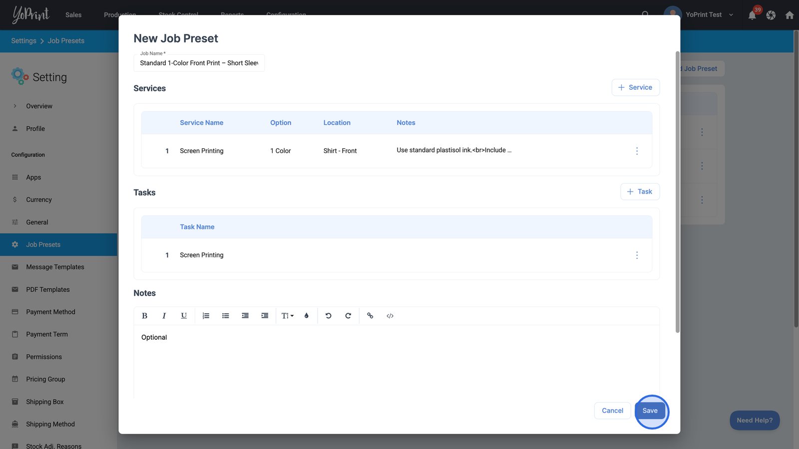 - Click the Save button at the bottom right to save the job preset you have configured.