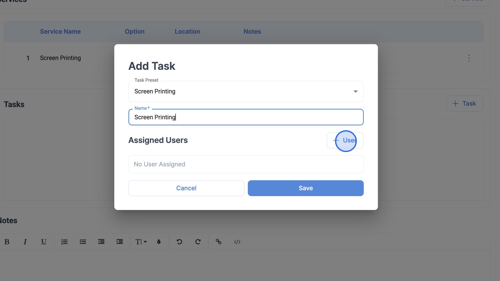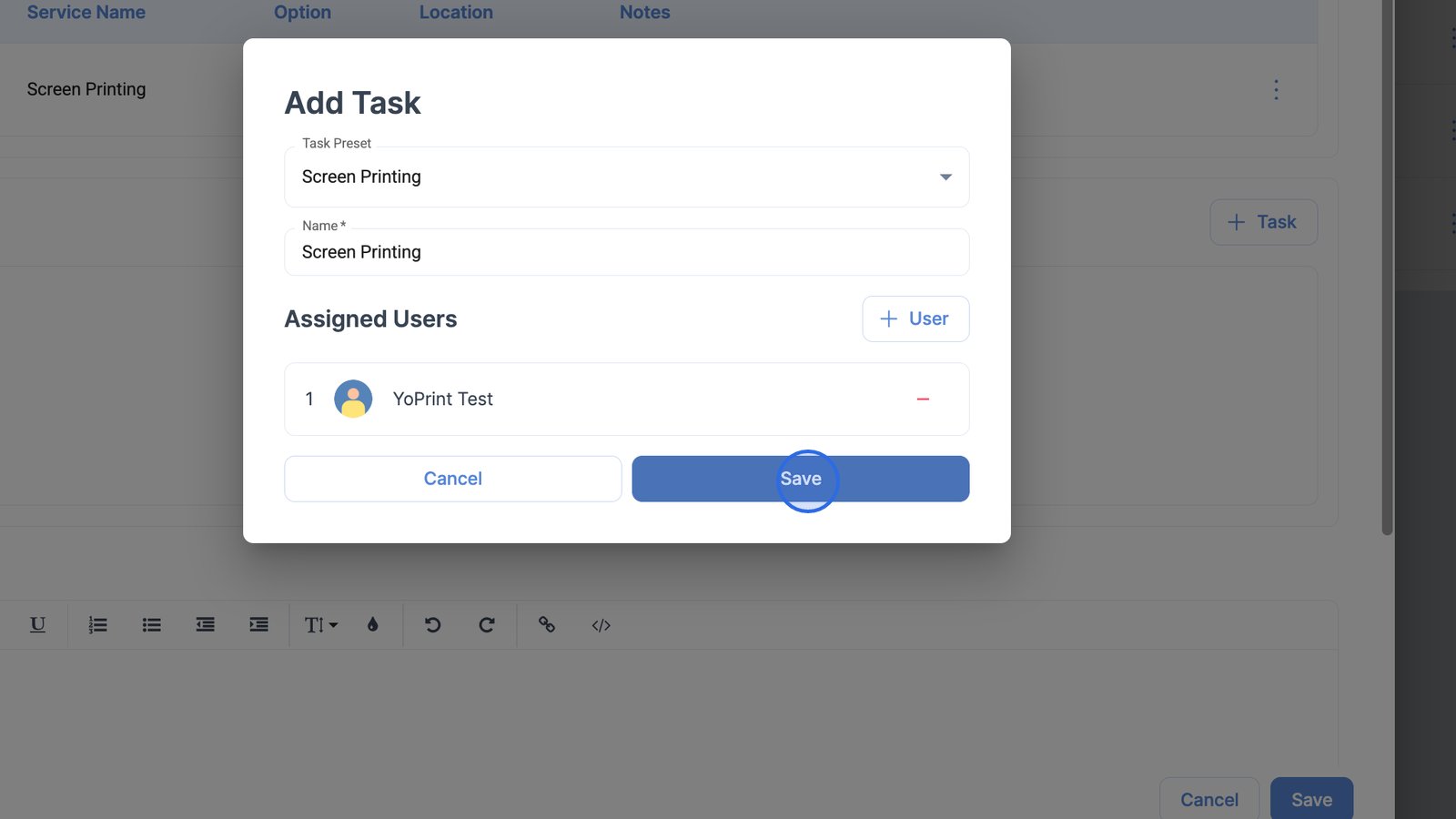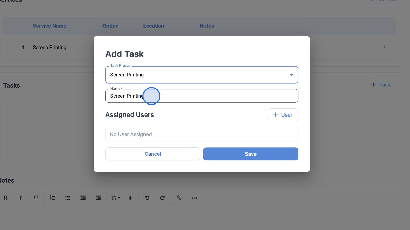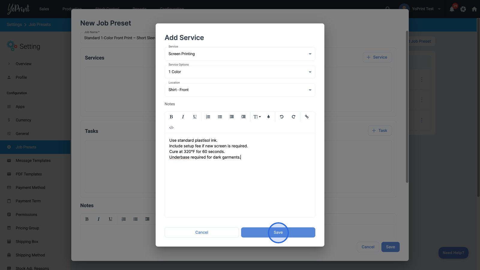 - Click the Save button to confirm and add the selected service to your new job preset.