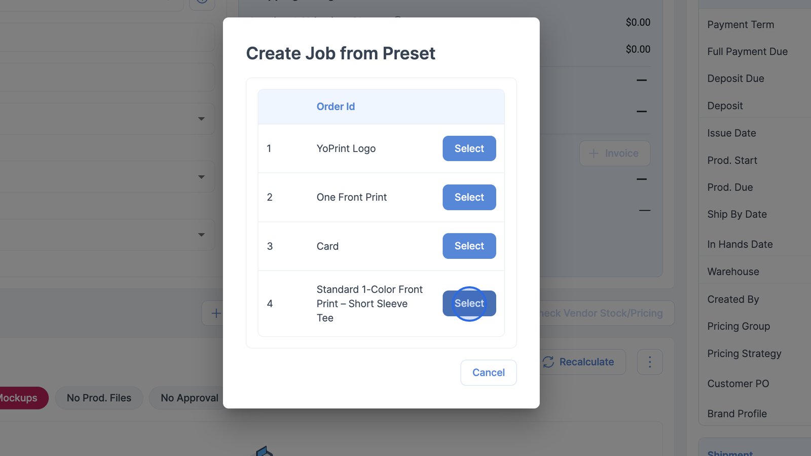 - In the dialog box, click Select next to your desired job preset to apply it to the order.