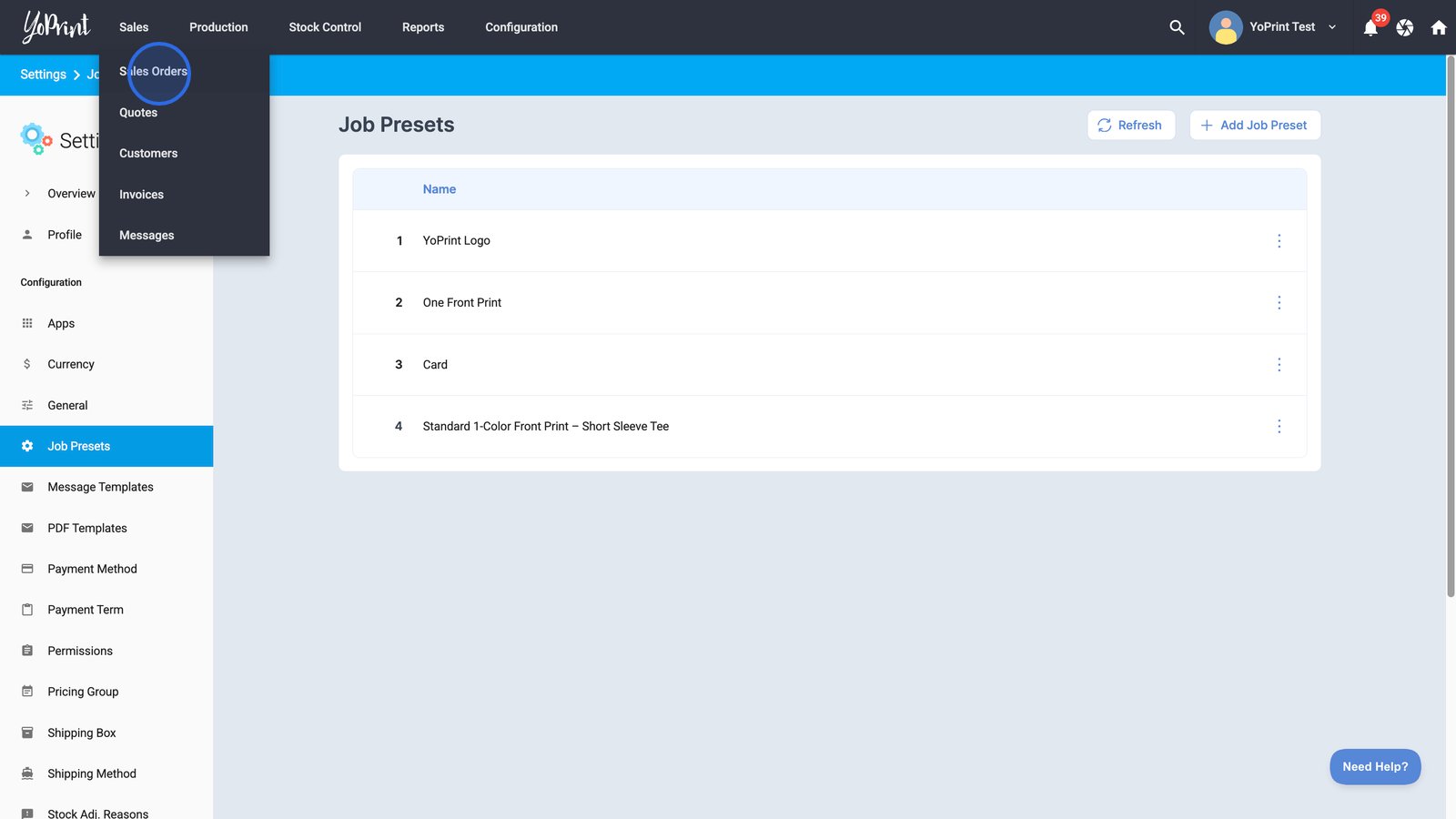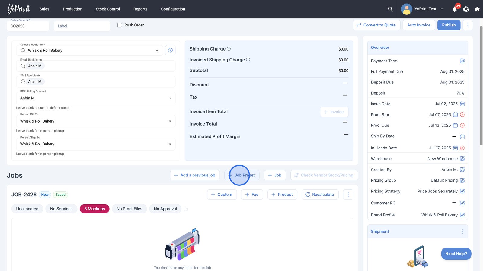 - Click the + Job Preset button within the sales order to add a predefined job setup quickly.